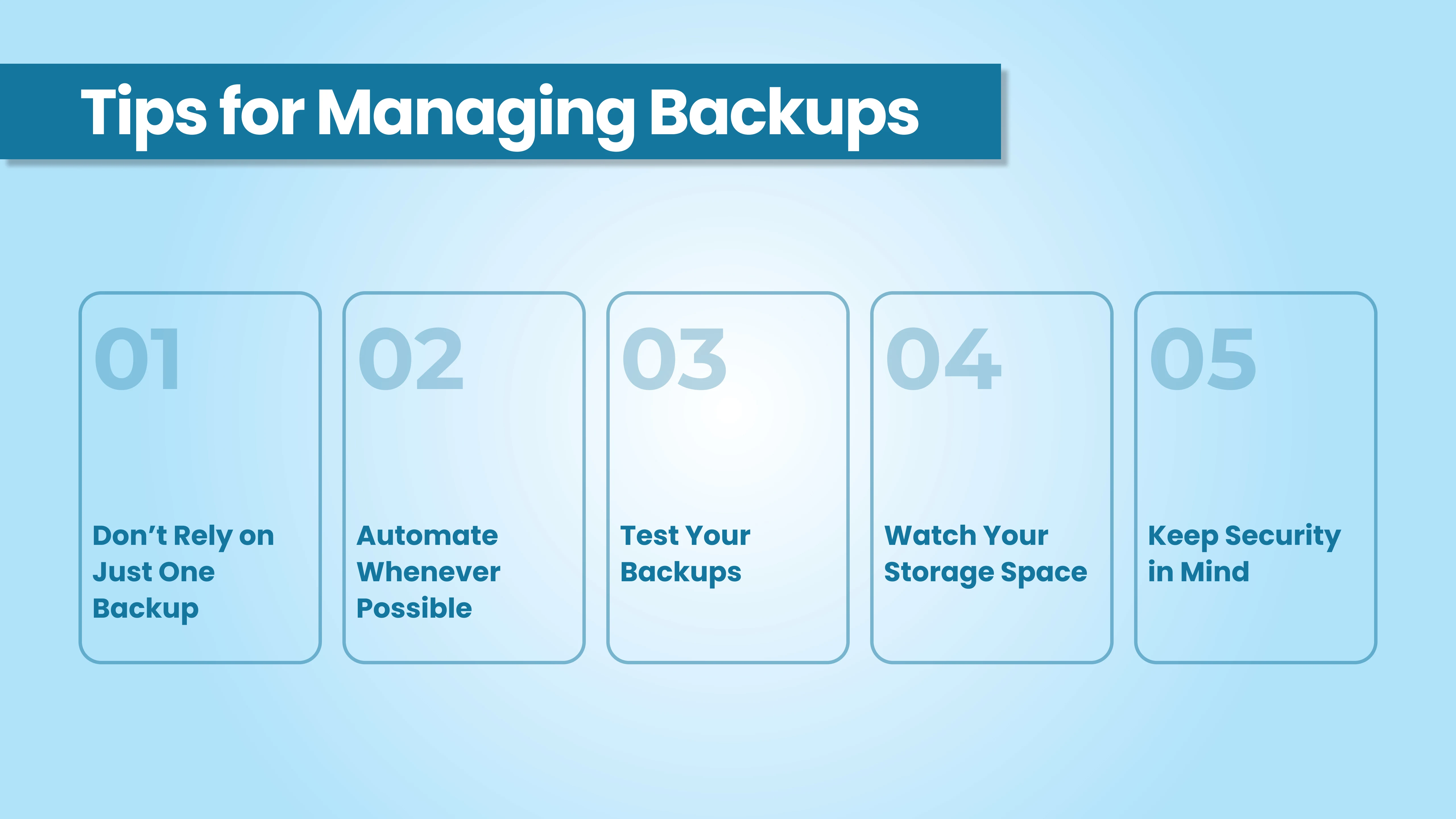 An effective backup strategy is not just about creating backups. It’s about keeping them safe, organized, and ready to use whenever you need them.